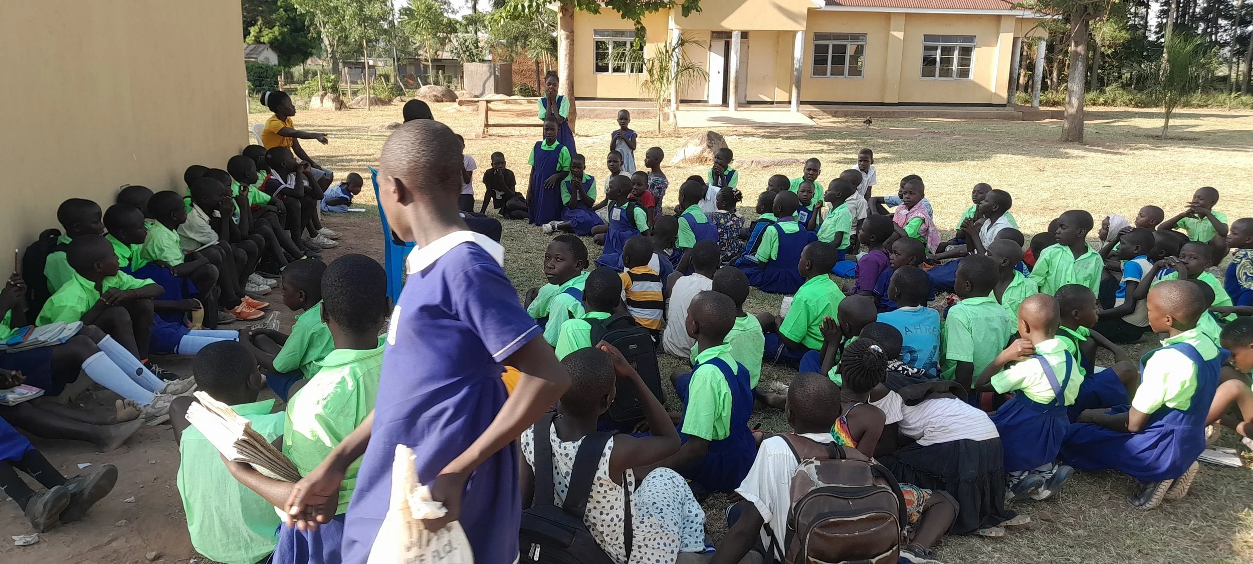 During a student assembly and dance performance, students showcased their memorized speeches. You can see the newly built classrooms on both the left and right sides of the photo.
